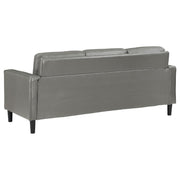 Establish the foundation of a stylish living room with a modern sofa. Smooth faux leather creates a sleek, neutral look that brims with sophistication. Track arms create a structured silhouette, offering tailored flair with an understated ambiance. Straight, tapered legs support the sofa and ensure stability. Supportive cushions create an inviting look and feel, with sinuous spring decking under seat cushions and webbing across the back for optimal comfort.