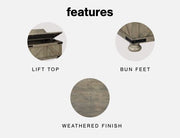 Double up on form and function with this square coffee table with storage. Its dual lid tabletop provides easy access to the roomy storage space. Crafted with solid pine wood treated to a weathered gray finish, this generously scaled coffee table is rustic farmhouse living at its best.