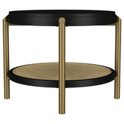 This round end table showcases a refined blend of natural and industrial elements, perfect for modern interiors. Crafted from Asian hardwood, engineered wood, and ash veneer, its finish highlights the table's organic grain for a subtle, rustic appeal. The lower shelf features natural woven rattan, offering functional storage with a stylish touch. Sturdy aged brass-finished metal legs provide contrast and durability. Ideal as a side table or accent piece, it combines elegance and utility effortlessly.