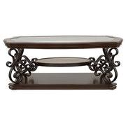 This elegant coffee table blends timeless design with practical functionality. The clear tempered glass top offers durability and a polished look, while the dark bronze powder-coated metal legs add a refined touch. A dark wood finish highlights the engineered wood and cherry veneer construction. The middle shelf features a glossy wooden surface, offering additional display or storage space. Intricate scrollwork detailing enhances the classic appeal, making it a perfect centerpiece for any living room.