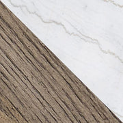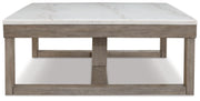 This coffee table is simple in design but big on style. Finished with a trend-right grayish brown wood tone, its bold, blocky profile and natural marble top are timeless classic choices that work so well with large sectional family room settings. Adding to its beauty, the marble top's color variations, fissures, mineral deposits and veining are naturally formed and are not defects.
