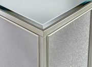 Reminiscent of Hollywood glamour of yesteryear, this set of nesting end tables interprets luxury in a decidedly modern way. A dazzling metallic silvertone finish and textured laminate panels for added luster enhance the star power, while the beveled inset mirrored tabletop brings that touch of glam you've been yearning for.