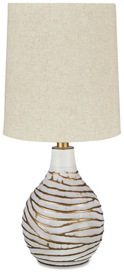 Shine a contemporary spotlight on your good taste with this table lamp. The antiqued white and goldtone finish of its base adds texture and interest to any space. With a modified drum shade, this light will illuminate your decor with style.