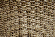 Powder coated steel frame. Resin wicker dining chairs and table. Resin wood look tabletop with umbrella hole. Black frame/tan wicker. Assembly required. Ashley Express.