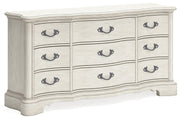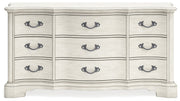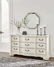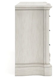 Add a touch of romance to your bedroom with this dresser. Its antiqued white painted finish and serpentine-shaped silhouette details are the picture of easy elegance. Drawers in multiple sizes offer ample storage space, while custom-designed bar pulls add originality.