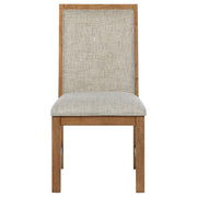 Soothing natural, neutral hues introduce refined style to a modern room set. Offering a soft natural brown wood grain finish over ash veneer and rubberwood, the set delivers an inviting, approachable ambiance to your kitchen or dining room. The table features a spacious rectangular tabletop with angled legs and an angular apron, creating eye-catching flair. Chairs offer soft oatmeal fabric upholstery over plush foam padding, and feature wooden ladder details on chair backs, adding a sense of character and structure. This charming set is a perfect choice for a family dining room.