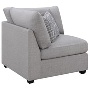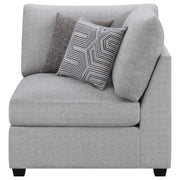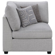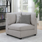 This corner chair enhances any modern living space with its clean design and modular flexibility. Upholstered in soft grey fabric, it features plush reversible cushions with feather-down wrapping for lasting comfort. Perfect for use as a standalone accent or combined with matching modular components, this chair allows for a fully customizable sectional configuration. Solid wood legs and a durable frame ensure stability, while its neutral tone complements both minimalist and colorful interiors with ease.