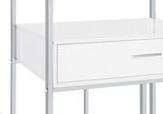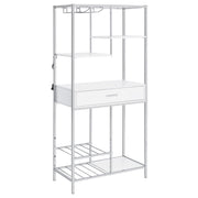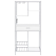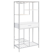A modular design with integrated LED lighting offers a fresh, modern look, perfect for hosting guests in your contemporary setting. This wine cabinet features a minimalist and linear design with four open shelves, a convenient pull-out drawer, two tiers of wine bottle storage, and integrated stemware racks. Constructed from engineered wood in a white high-gloss, scratch-resistant finish, it is complemented by a sleek silver-finished rectangular frame. Combining style and functionality, it’s an ideal choice for serving and entertaining.
