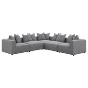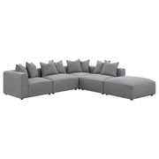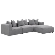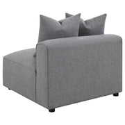 Expand your seating with this modular armless chair, designed to blend seamlessly into a sectional sofa or stand alone as an accent piece. Upholstered in soft grey woven fabric, it offers a versatile neutral palette that suits any living room or entertainment area. The low-profile silhouette features a tight seat with welt trim detailing, paired with plush down-like cushions for exceptional comfort. Supported by discreet black legs with non-skid grip protectors, it ensures both style and stability.