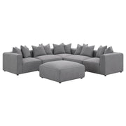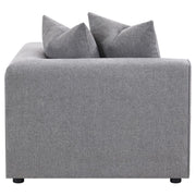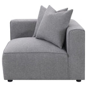 Transform your modular sectional into a L-shaped configuration with this clean and contemporary modular corner chair. With a low-profile design of a track style backrest that doubles as arms, this modular corner chair caps one end of a long sectional sofa and bridges together two main pieces. The tailored tight seat is accented with welt trim along the upper edge. Lending a neutral color palette to enhance with decorative pillows or leave to its sophisticated tone, a soft grey woven fabric brings it all together. Matching pillows offers a plush backing to soften the hard line track back design.
