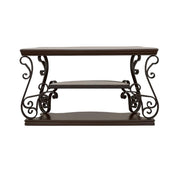 This elegant console table, also known as a sofa table, seamlessly combines style and function. Its dark merlot wood finish highlights the engineered wood and cherry veneer construction, while the ornate scrollwork on the dark bronze powder-coated metal legs enhances its timeless charm. The polished wooden middle and bottom shelves offer additional storage or display space. Perfect for accentuating hallways, living rooms, or behind sofas with classic sophistication.