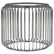 With a chic Art Deco vibe and retro-inspired flair, comes this modern dining table base. Featuring a cylindrical shape surrounded by slim metal rods all around, this dining table base gives off a cage-like appearance and an open and airy style. With a lustrous polished chrome finish throughout, it opens itself up to existing color palettes, allowing you to play with tablescapes and seating as you wish. Versatile and convenient, this sturdy metal base allows you to top whatever size or shape tabletop you desire in the space. Make it a dramatically bold, wide end table or an oversized round dining table suitable for multiple guests.