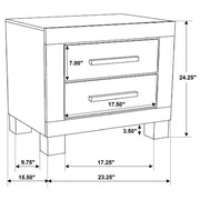 Add rustic charm and practical storage to your bedroom with this two-drawer nightstand. Crafted from solid hardwood, it features a full matte rustic golden brown finish with wire-brushed details that highlight the natural wood grain. Two spacious slide-out drawers keep bedside essentials neatly tucked away, while sturdy block-style legs provide durability and support. Finished with wooden pull handles for a cohesive design, this nightstand combines rugged character with timeless functionality, making it a perfect companion to any transitional bedroom setting.